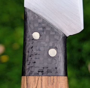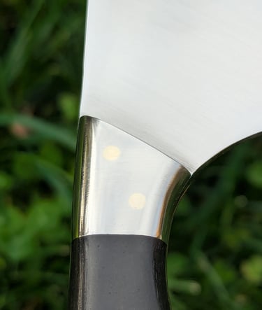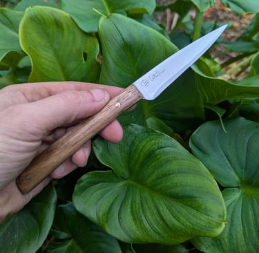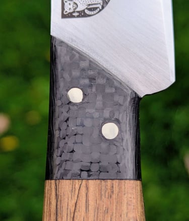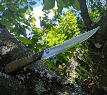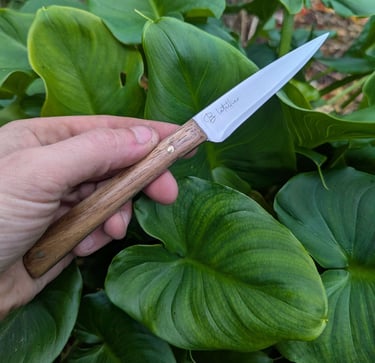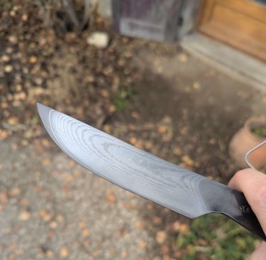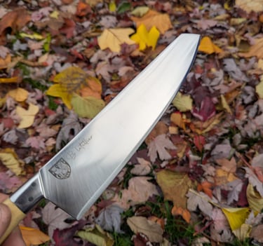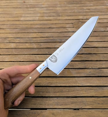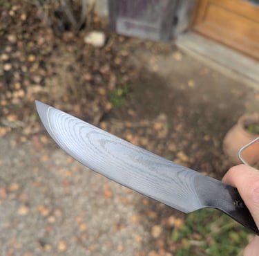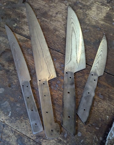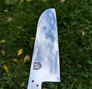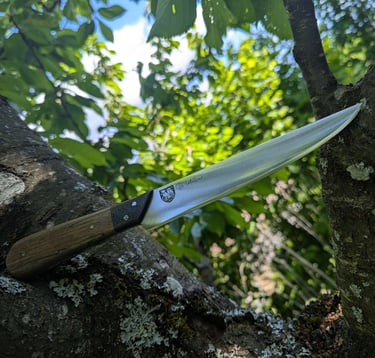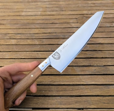 Je propose des couteaux d'office, des tranchelards, des éminceurs, des couteaux à pain mais aussi des créations originales. Toutes les lames sont en acier inoxydable 14C28N, ou en suminagashi sur demande.