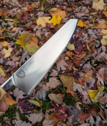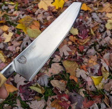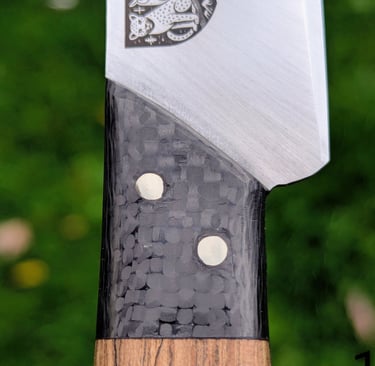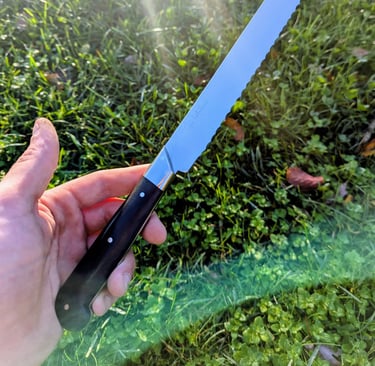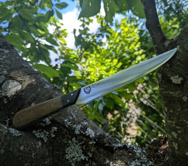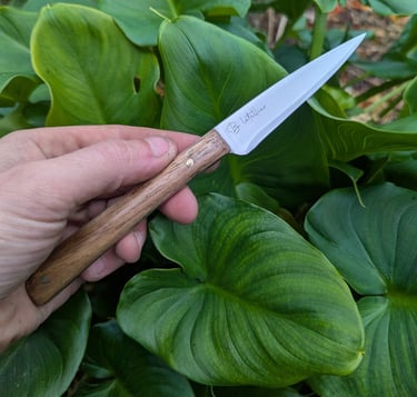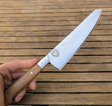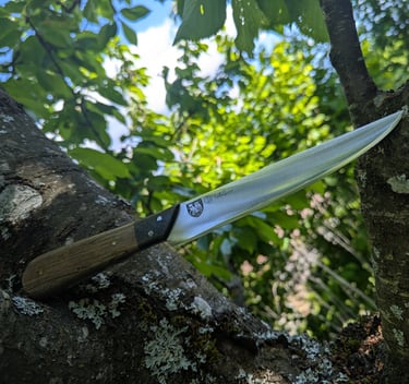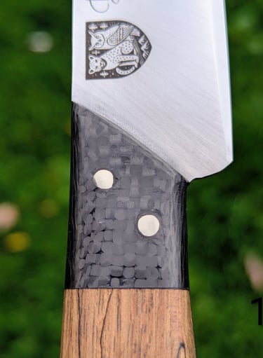 Je propose des couteaux d'office, des tranchelards, des éminceurs, des couteaux à pain mais aussi des créations originales. Toutes les lames sont en acier inoxydable 14C28N, ou en suminagashi sur demande.